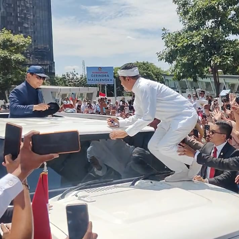 Saat diangkat, KDM spontan hormat pada Prabowo yang menyapa warga dari rooftop mobil. Seketika Prabowo pun tersenyum dan mengajak KDM bersalaman.